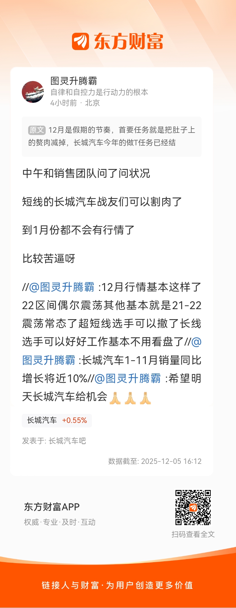 大家可以参考一下//@图灵升腾霸 :中午和销售团队问了问状况短线的长城汽车战友们可以割肉了到1月份都不会有行情了比较苦逼呀//@图灵升腾霸 :12月行情基本这样了22区间偶尔震荡其他基本就是21-22震荡常态了超短线选手可以撤了长线选手可以好好工作基本不用看盘了//@图灵升腾霸 :长城汽车1-11月销量同比增长将近10%//@图灵升腾霸 :希望明天长城汽车给机会