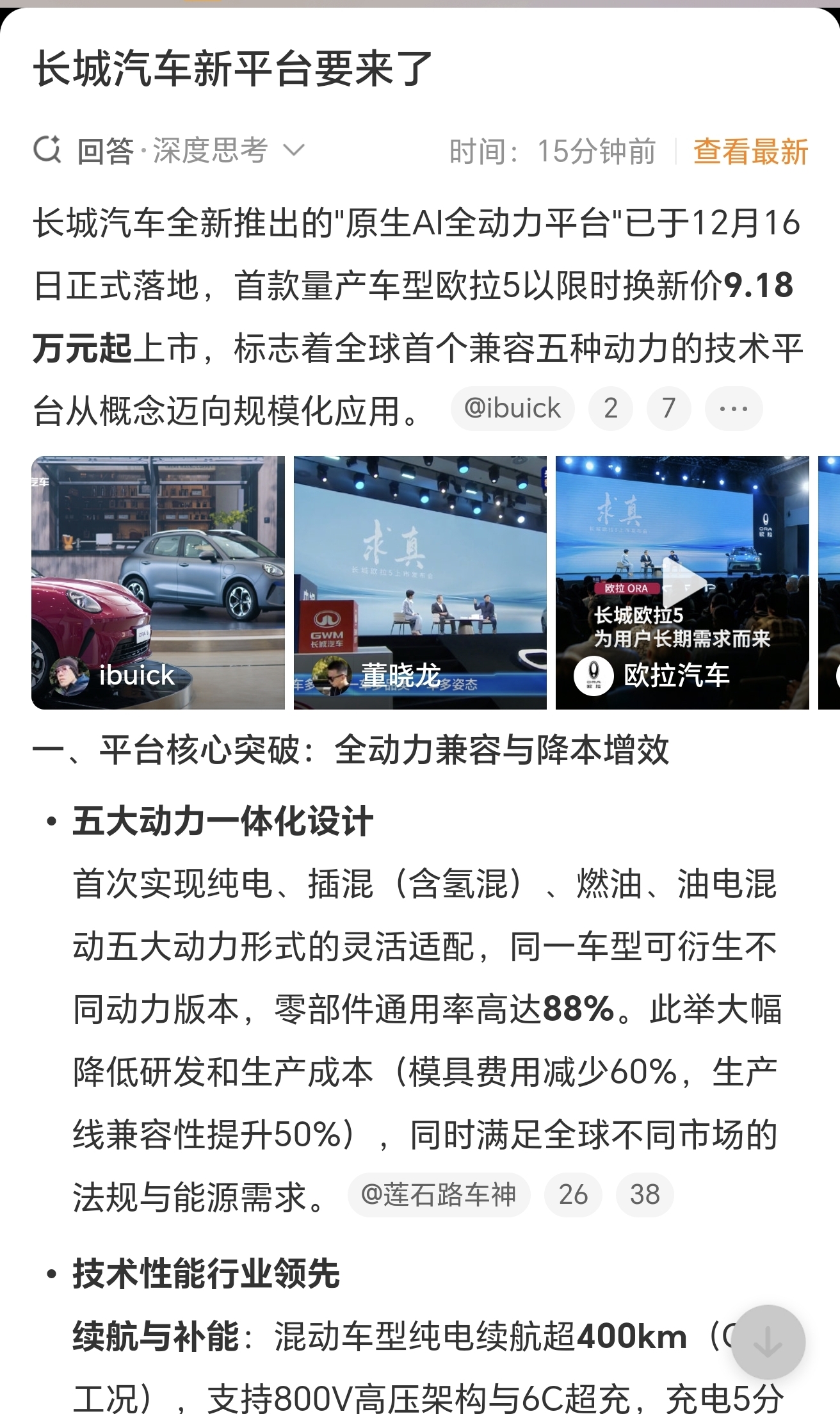 长城面向全球的全动力平台正式推向市场,率先在欧拉5上搭载。全新动力平台的推出,是中国车企面向全球市场深化布局的首个解决方案,一下子把市场面扩大了四五倍,长期成本降低了40%。全新的开始,全新的估值,GWM