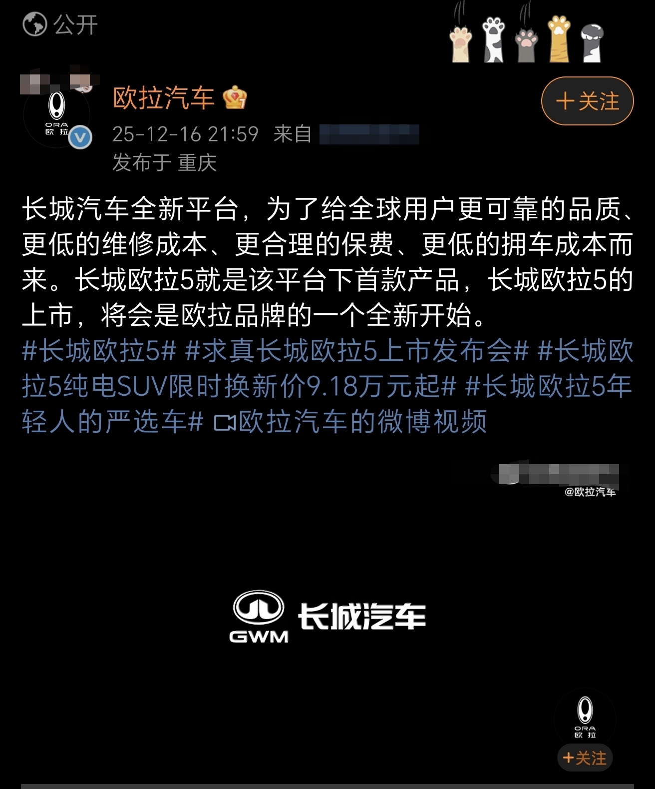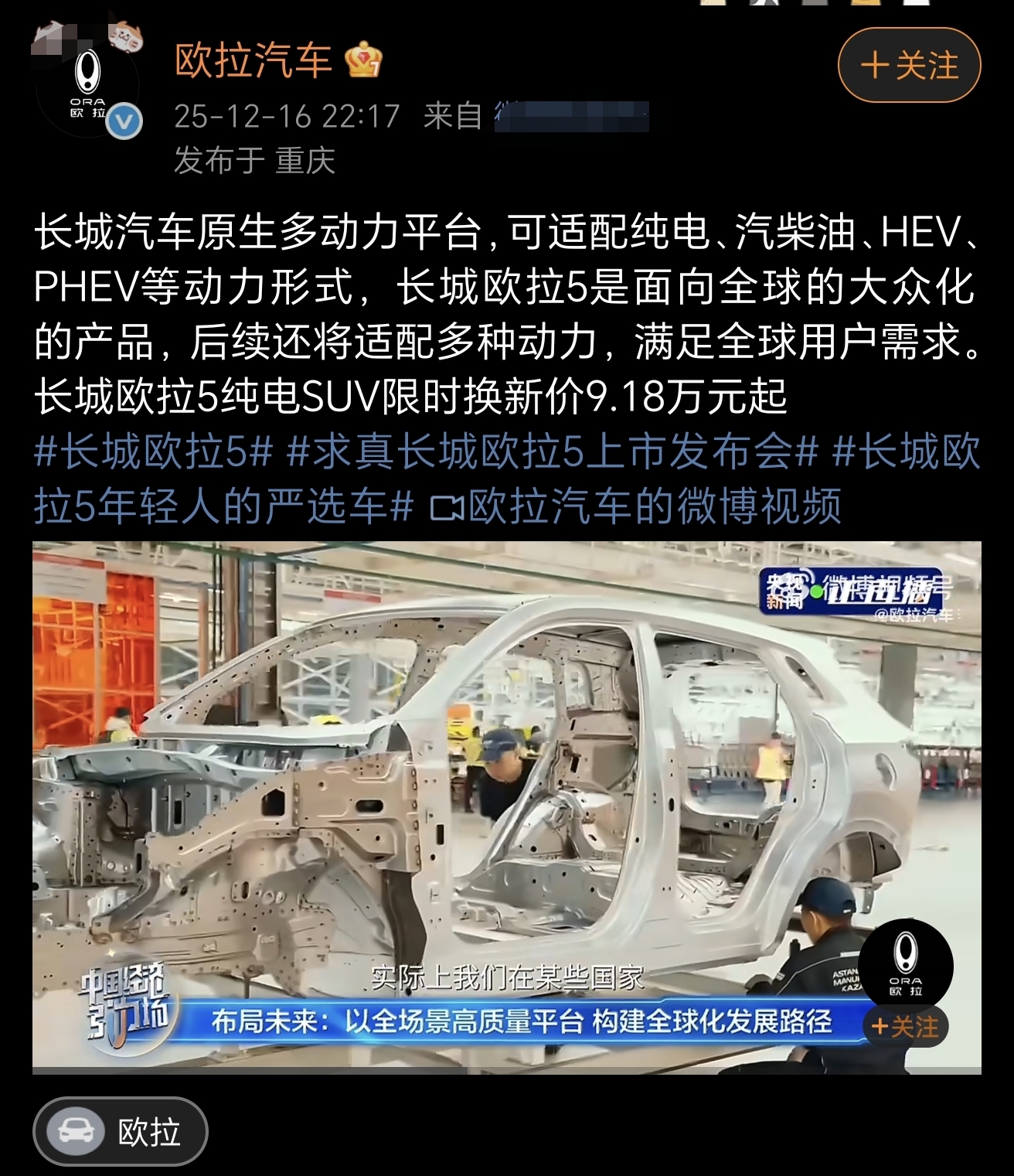 长城面向全球的全动力平台正式推向市场,率先在欧拉5上搭载。全新动力平台的推出,是