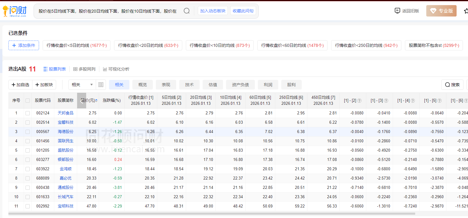 仔细搜索了下,去除ST两市在所有均线下面的应该只有11只