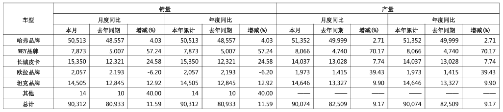 长城汽车1月总销量9.03万台 同比增长11.59%