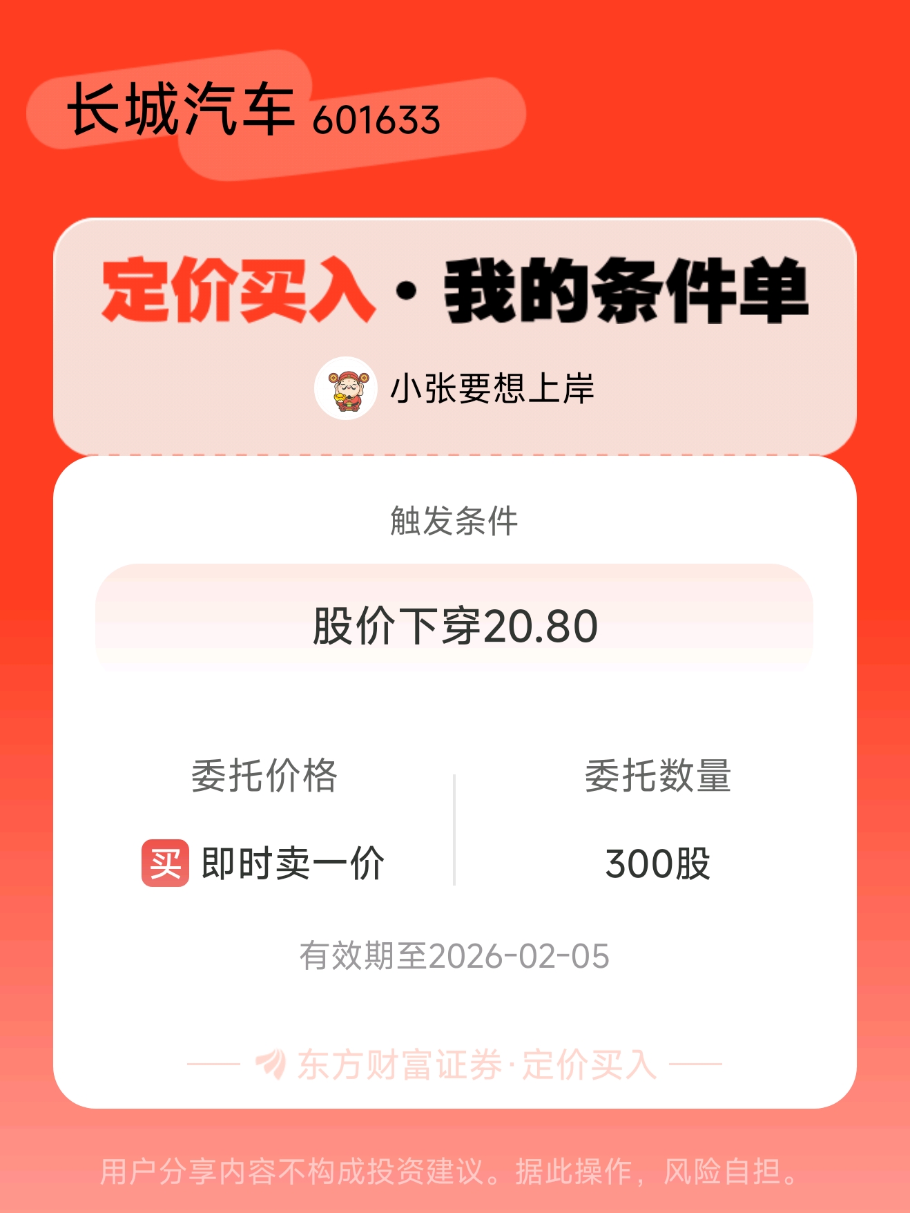 #条件单交流# #定价买入晒单# 一位股神设置了一个定价买入条件单,接下来就是见证奇迹的时刻~$长城汽车(SH601633)$