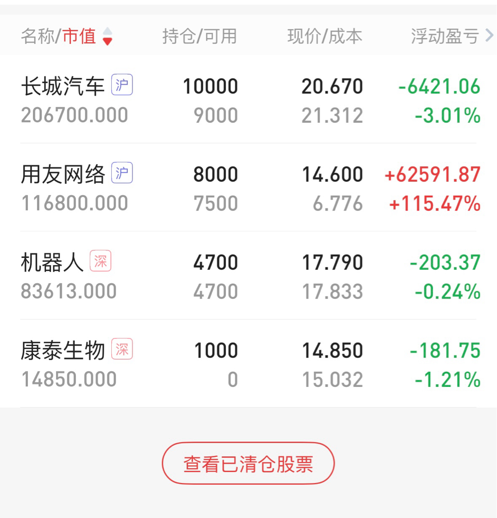 $长城汽车(SH601633)$ $用友网络(SH600588)$ $机器人(SZ300024)$ 心累~节前红包没有了,不知道节后是福是祸~今天补了1000股长城汽车,除了拉垮还是拉垮。机器人回本卖了些~看康泰生物跌到挺惨了买了1000股~