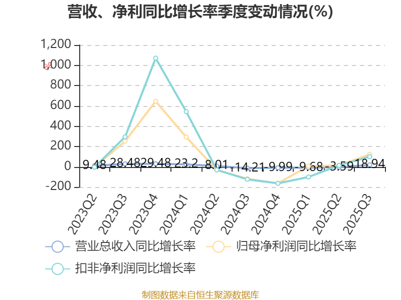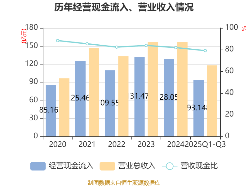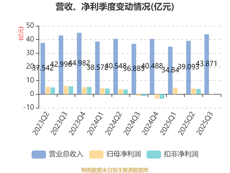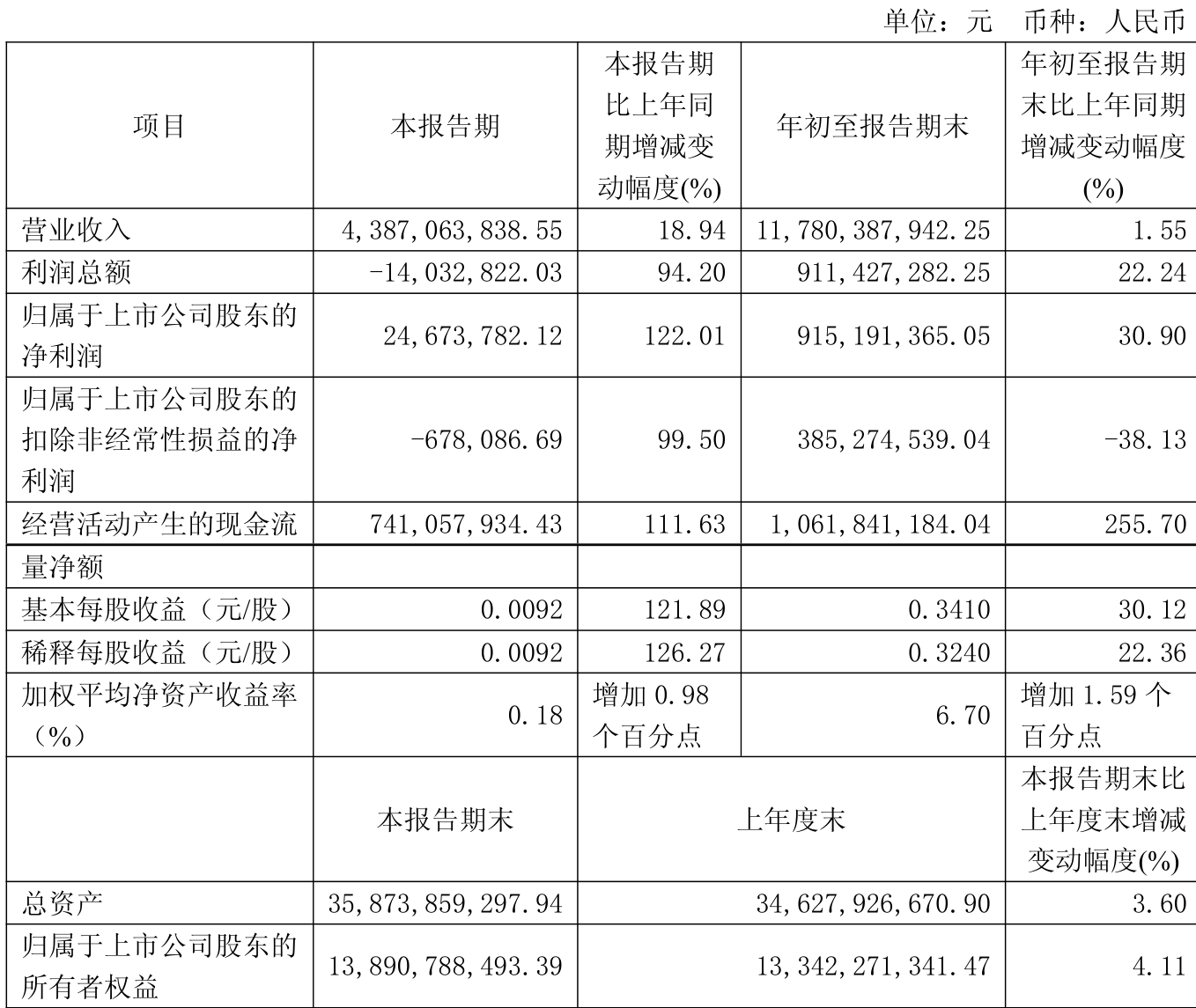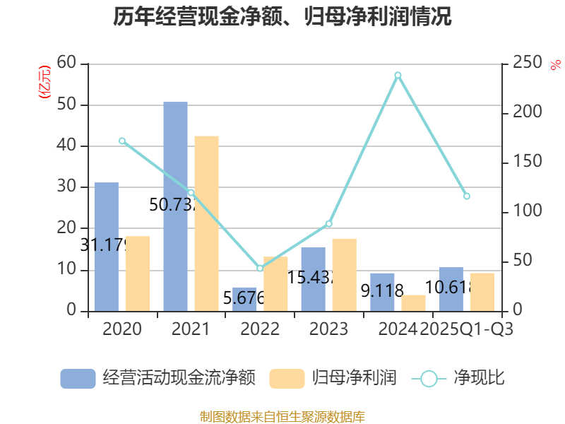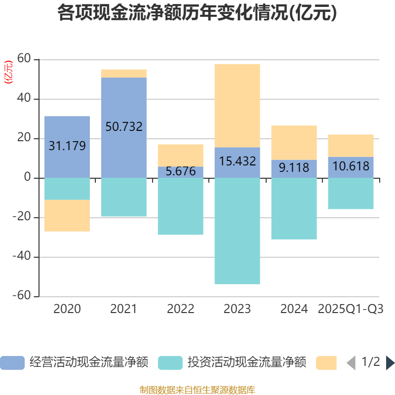2025年前三季度,公司经营活动现金流净额为10.62亿元,同比增长255.7%;筹资活动现金流净额11.26亿元,同比减少12.94亿元;投资活动现金流净额-15.88亿元,上年同期为-35.78亿元。