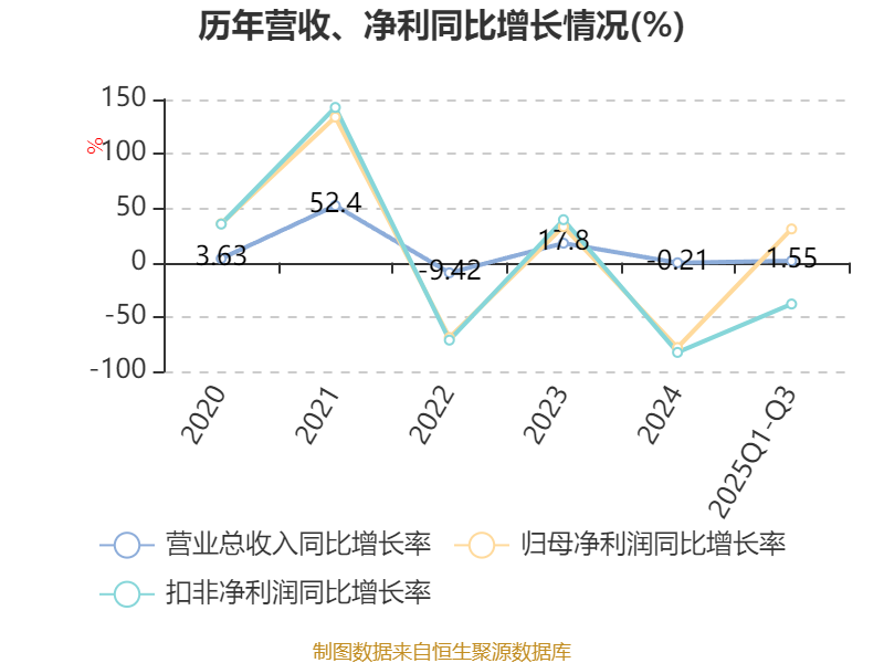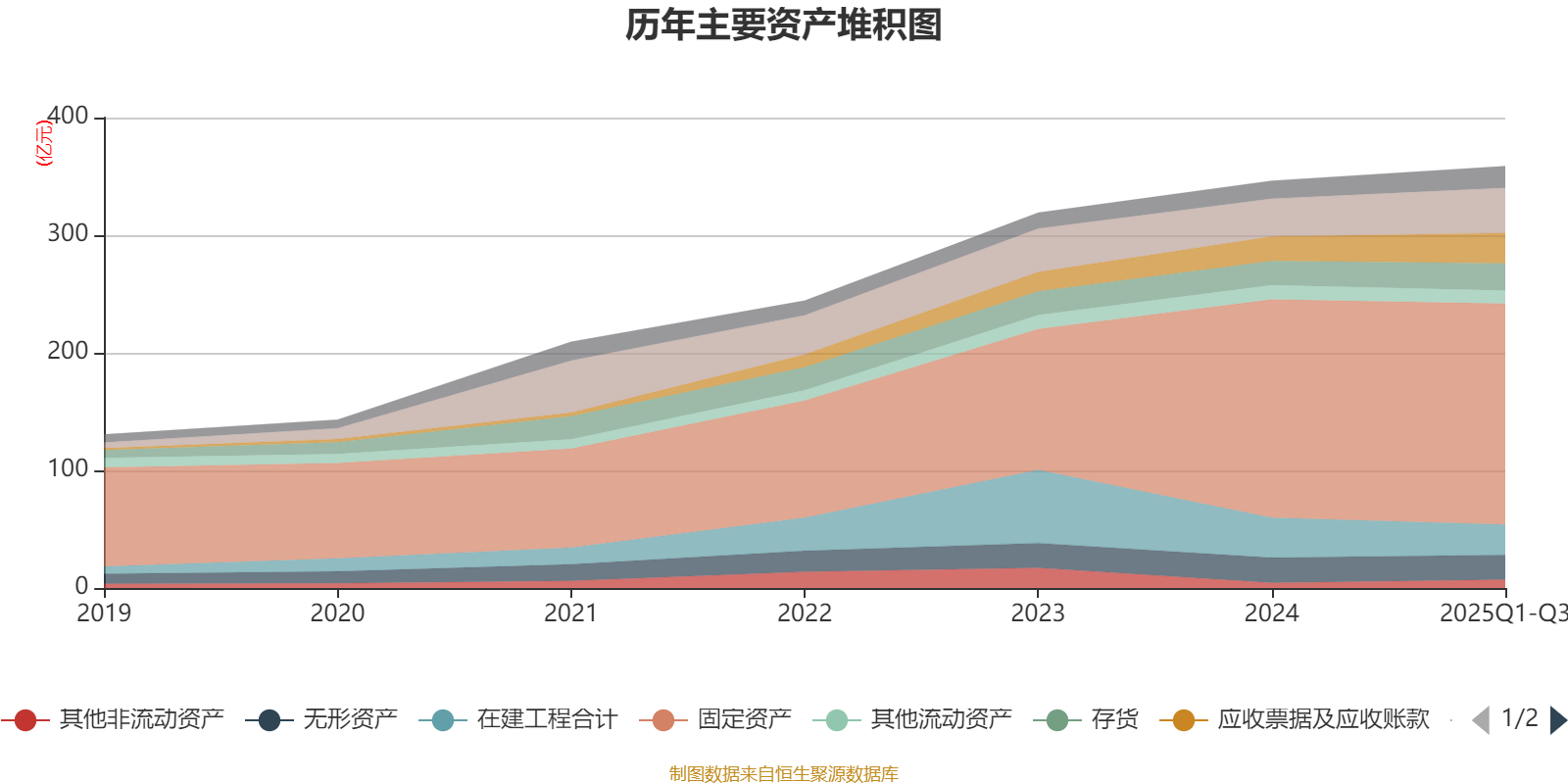 资产重大变化方面,截至2025年三季度末,公司在建工程合计较上年末减少24.24%,占公司总资产比重下降2.63个百分点;货币资金较上年末增加19.69%,占公司总资产比重上升1.44个百分点;固定资产较上年末增加1.24%,占公司总资产比重下降1.22个百分点;应收票据及应收账款较上年末增加23.92%,占公司总资产比重上升1.18个百分点。