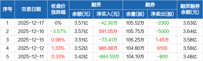 旗滨集团融资融券信息显示,2025年12月17日融资净偿还42.9万元;融资余额3.57亿元,较前一日下降0.12%。