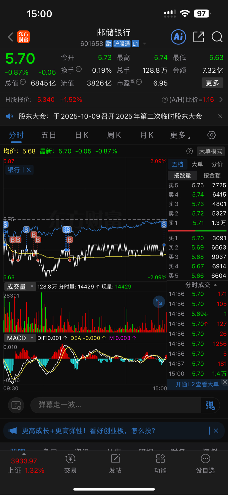 $邮储银行(SH601658)$ 尾盘最后时刻T掉能T的仓位,总体仓位依然维持在五层。很可惜今天六大行唯一绿盘还绿了将近一个点,留了半仓明天操作继续T,T到企稳反转为止。目前为止利润依然稳固,银行的美妙就是这样,总是能有小利润吃。总体依然继续看好后续突破6.44,咬定青山不放松,继续坚持,期待反转,祝大家好运。