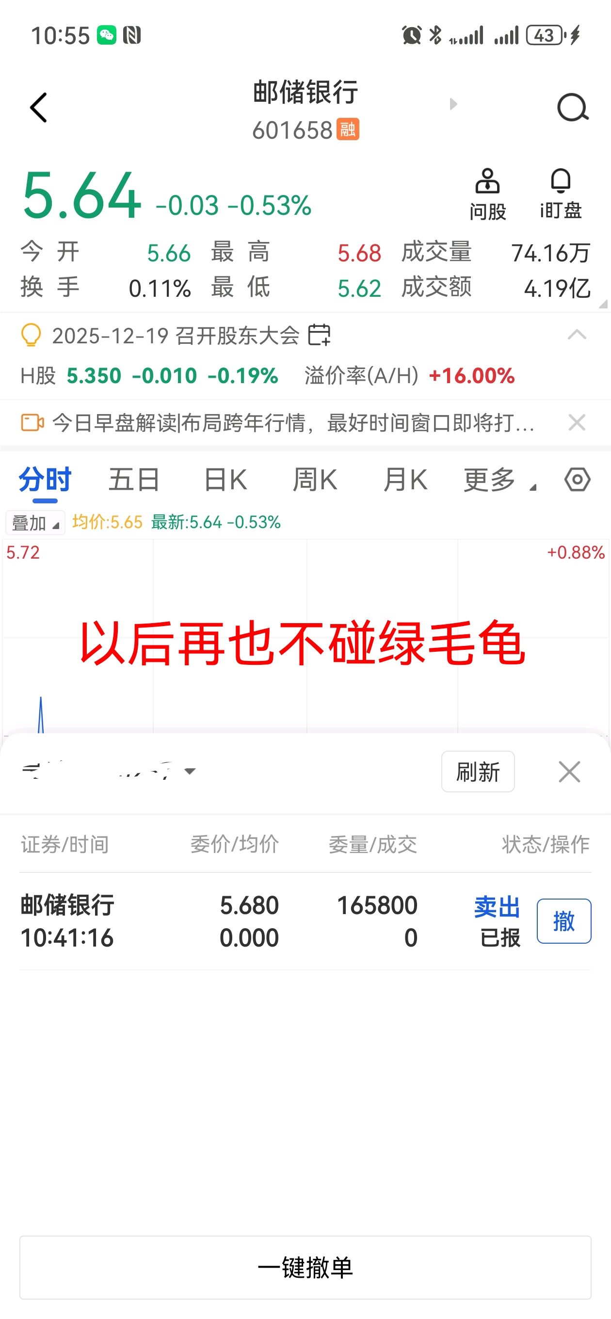 $邮储银行(SH601658)$ 以后再也不碰绿毛龟,跟跌不跟涨,拿股息有其他更好的选择
