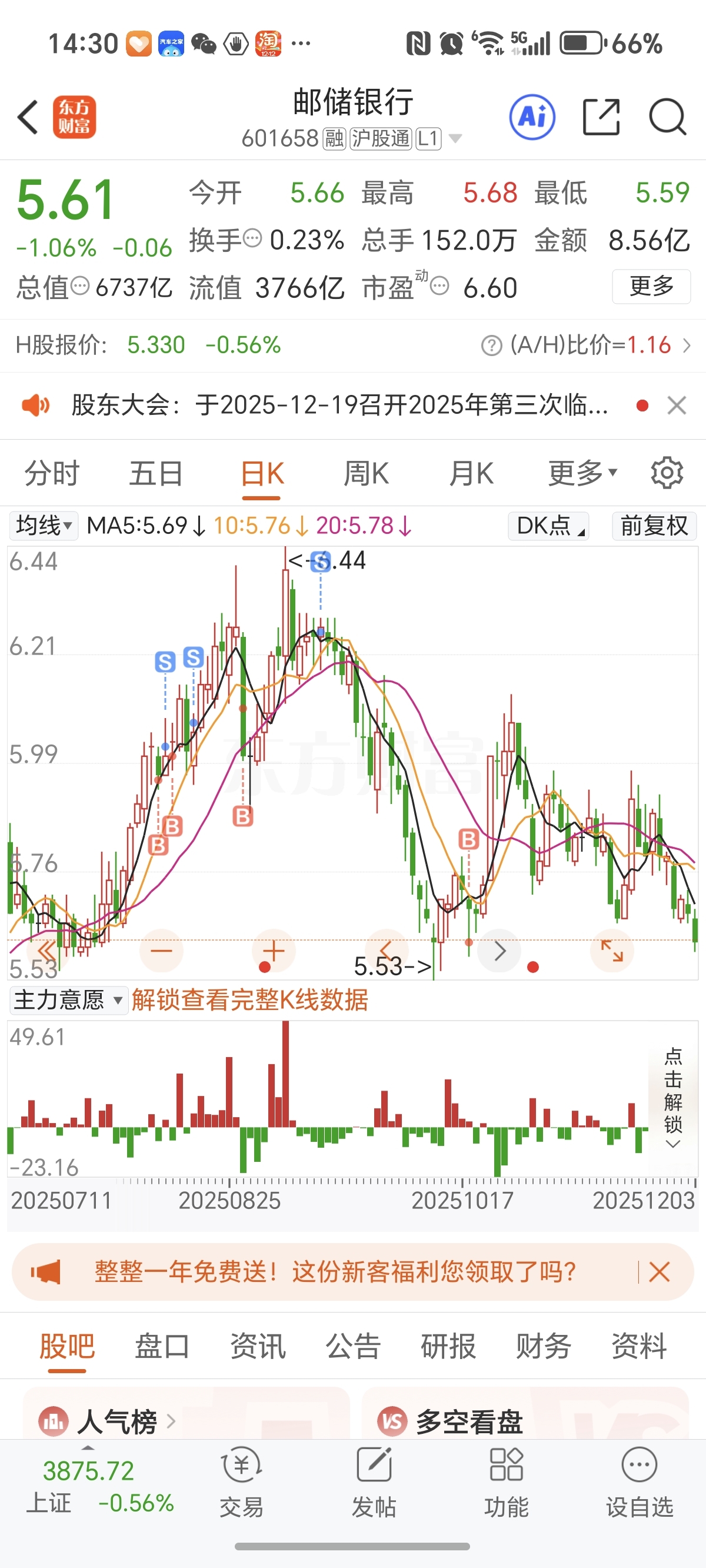 $邮储银行(SH601658)$ 虽然没几手,但是也已经触碰到我的底线了