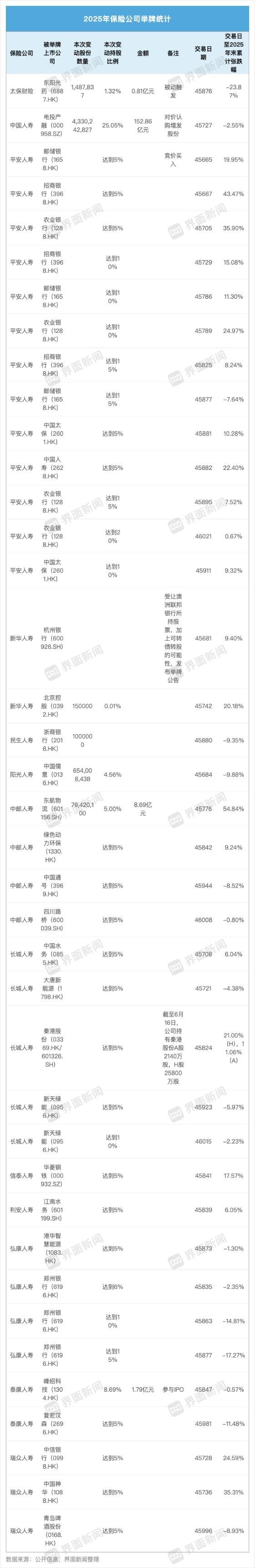 据界面新闻记者统计,2025年,保险公司举牌上市公司次数高达39次,共涉及13家保险公司及28家上市公司,其中港股上市公司占比近八成。板块方向上更集中于银行股、能源等公共事业领域。