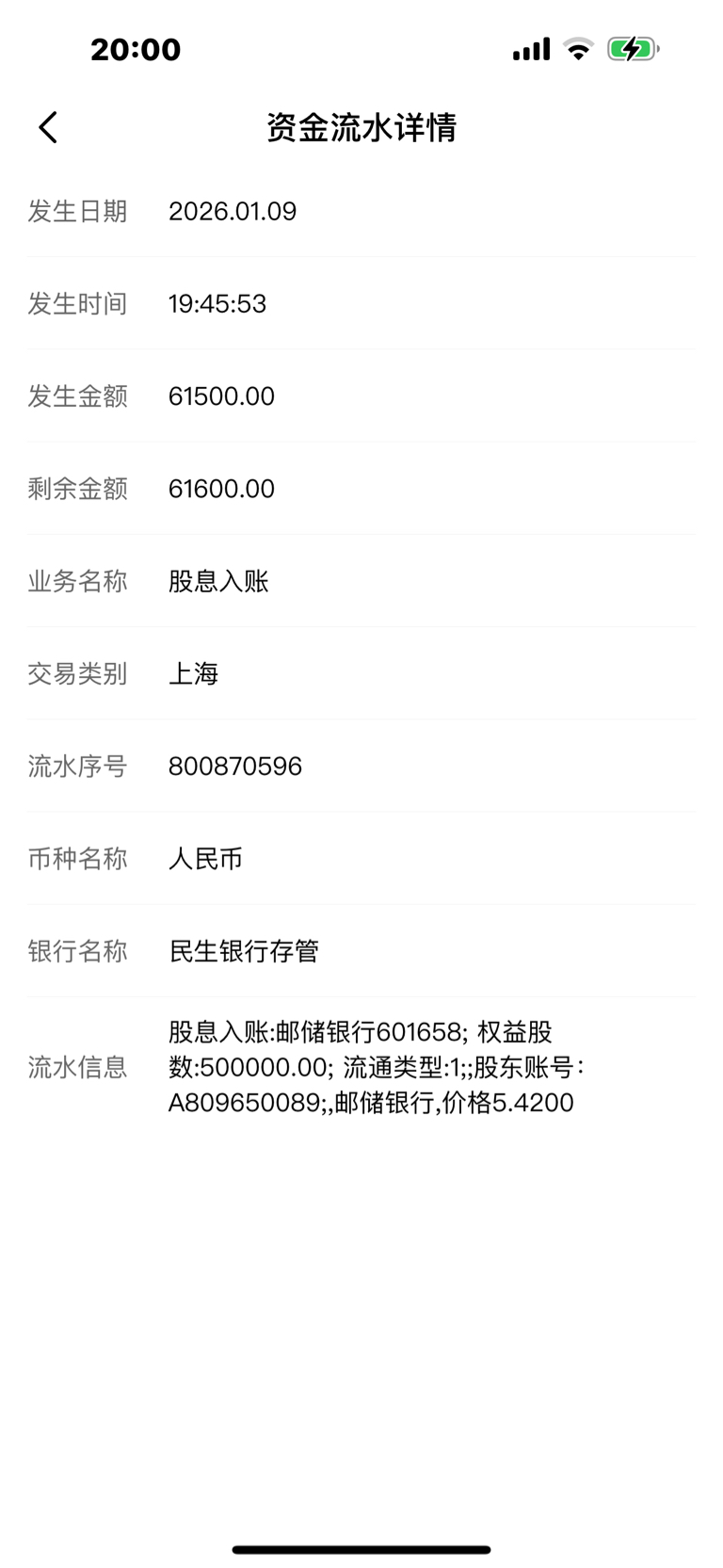 $邮储银行(SH601658)$ 股息到账,可以消费,可以复投,谁说分红分自己的钱?那是炒股的人认为,对于我一个懒人来说就喜欢分红