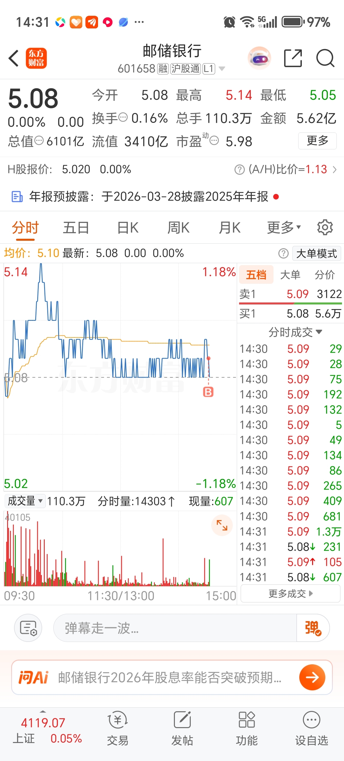 $邮储银行(SH601658)$ 打个底层,试试水。