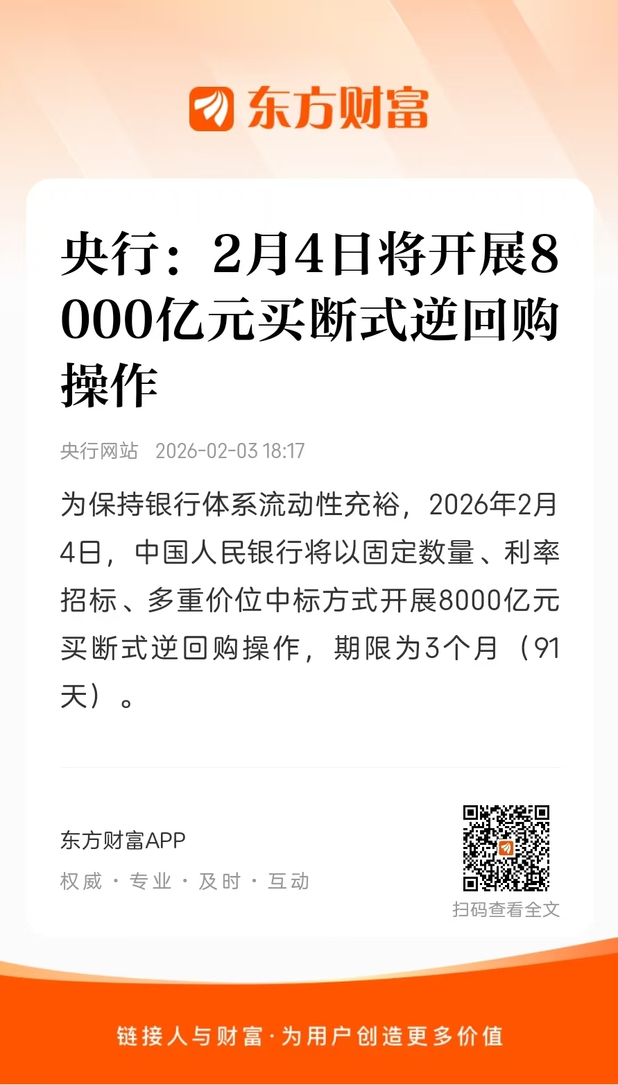 $邮储银行(SH601658)$ 中国人民银行:为保持银行体系流动性充裕,2026年2月4日,中国人民银行将以固定数量、利率招标、多重价位中标方式开展8000亿元买断式逆回购操作,期限为3个月(91天)。
