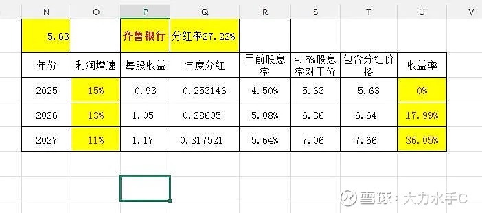 $齐鲁银行(SH601665)$ 齐鲁银行目前股价5.63元,分红率27.22%,股息率4.5%。假定25年业绩增速15%,26年13%,27年11%(我的测算比较保守),分红率维持27.22%不变(实际上随着永续债赎回,分红率还会进一步提升一些),到了27年底,假如股息率维持4.5%不变,那时4.5%对应的股价是7.06元,相对于现在5.63元买入,2年时间收益率36%(加分红)。