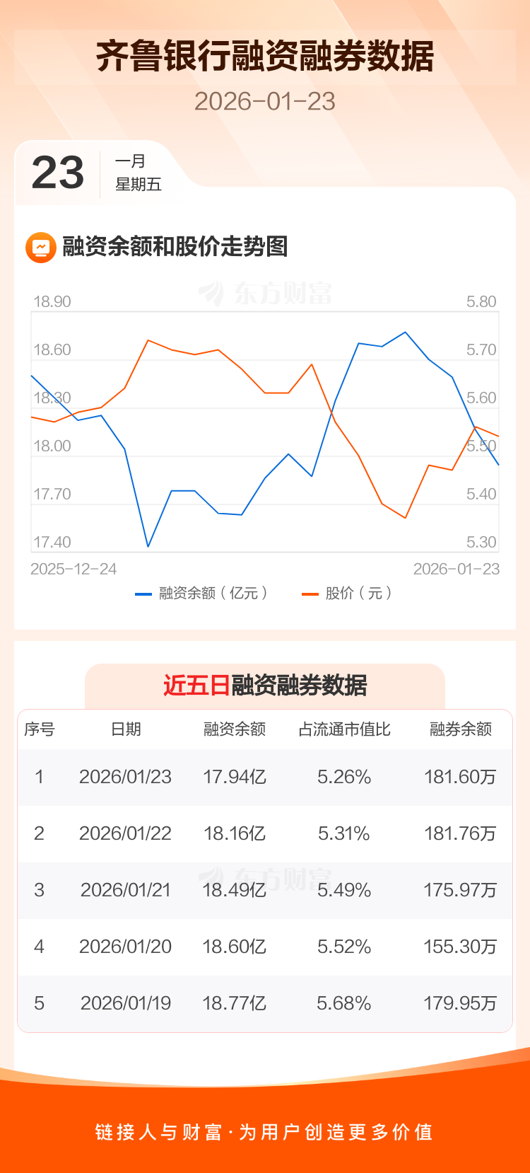交易所最新数据显示,齐鲁银行于2026年1月23日获融资买入3296.96万元,融资偿还5462.79万元,当日融资净偿还2165.83万元。目前,该股融资余额17.94亿,占流通市值比例为5.26%。