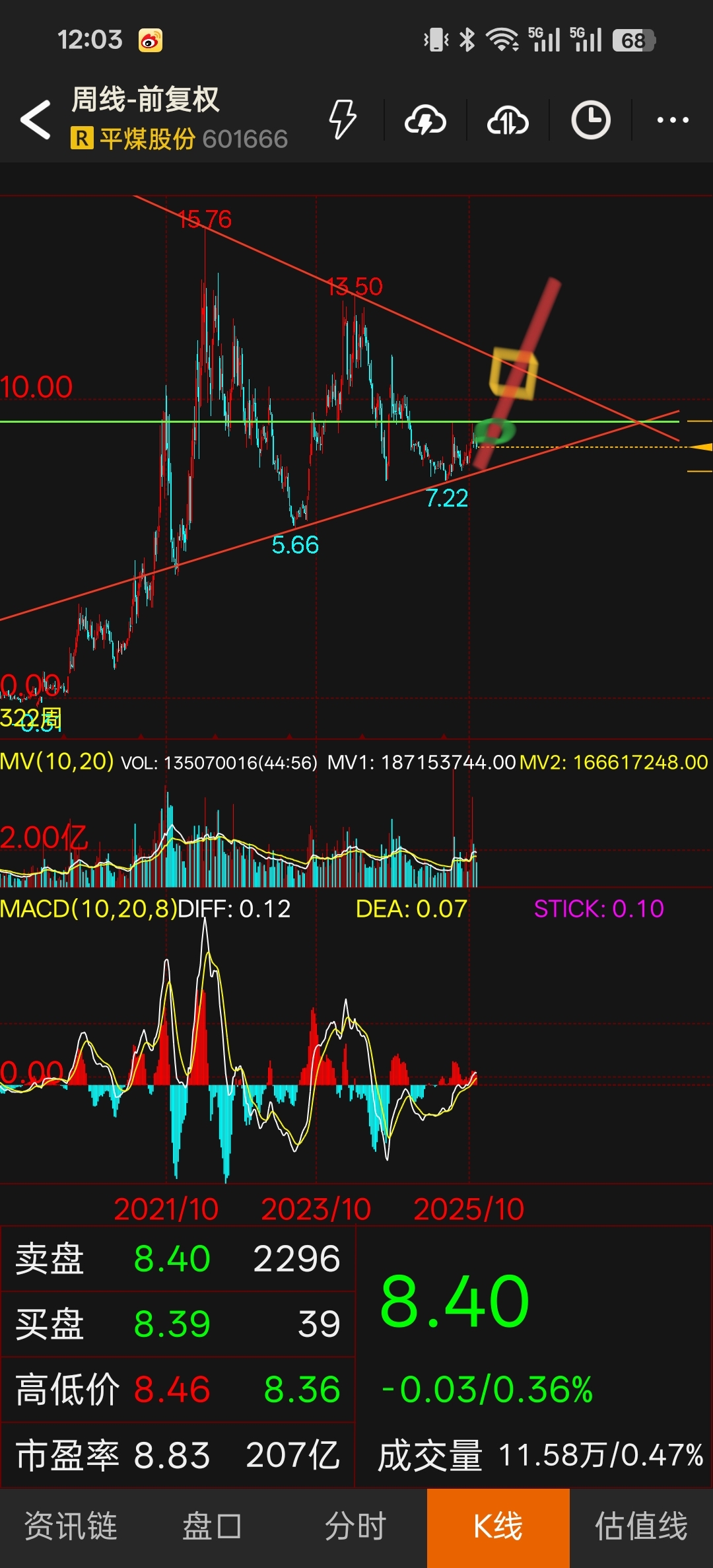 平煤会依次向上突破,突破绿色颈线,突破压力线,突破13.5元和15.76元!耐心