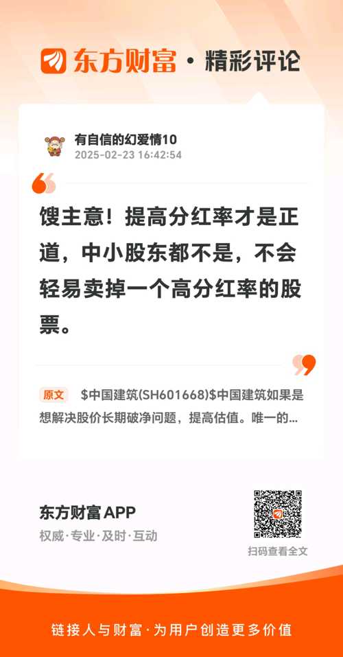 试想一下,如果公司发布公告承诺,分红率提高到每年收益的百分子70以上,卖掉中国建筑股票的股东就会后悔,手中有持股票的会增加股票的持有量。//@有自信的幻爱情10 :馊主意!提高分红率才是正道,中小股东都不是,不会轻易卖掉一个高分红率的股票。