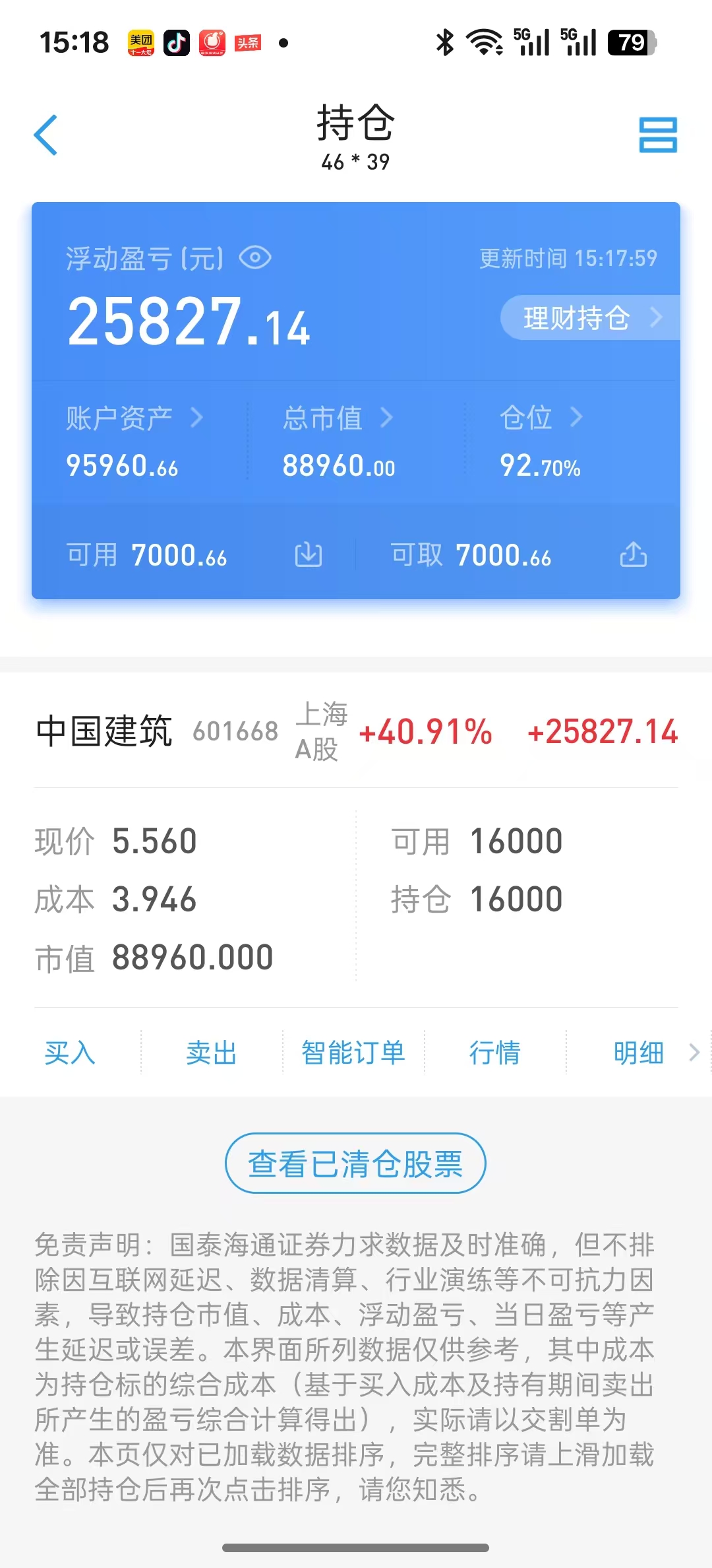 今天节后开盘中国建筑走势不错。明天走势很关键,明天我赌中国建筑收涨。如果明天中国建筑收涨,接下来一个月中国建筑就好操作了——坚决持股不动即可。