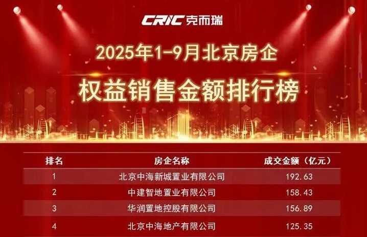 根据克而瑞公布的2025年1-9月北京房企权益销售金额TOP30排行榜,中海新城成交金额192.63亿元,位列第1位;中建智地成交金额158.43亿元,位列第2位;北京中海成交金额125.35亿元,位列第3位;中建玖合成交金额46.86亿元,位列15位。此外,中建壹品(中建三局,总部位于武汉)第18位,成交金额39.51亿元;中建东孚(中建八局,总部位于上海)第27位,成交金额18.71亿元。