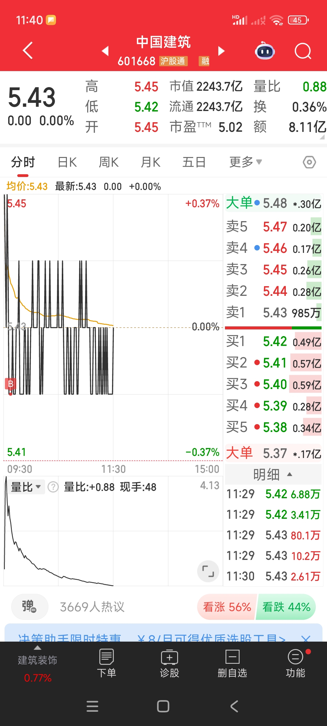 真没劲,前低5.37都没到!5.42买到400股。应该一鼓作气,跌破5元呀!