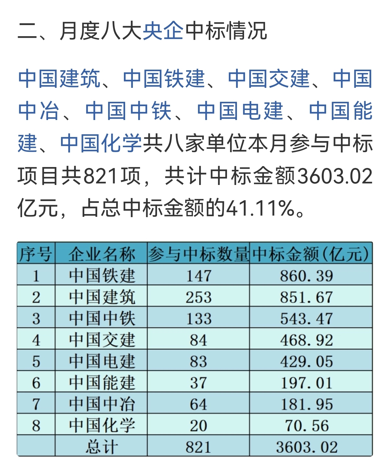 10月全国投资类和非投资类项目共成交1998个,总计8764亿,9月为12044亿,10月下滑-27%,中国铁建860亿排名第一,中国建筑851亿排名第二。