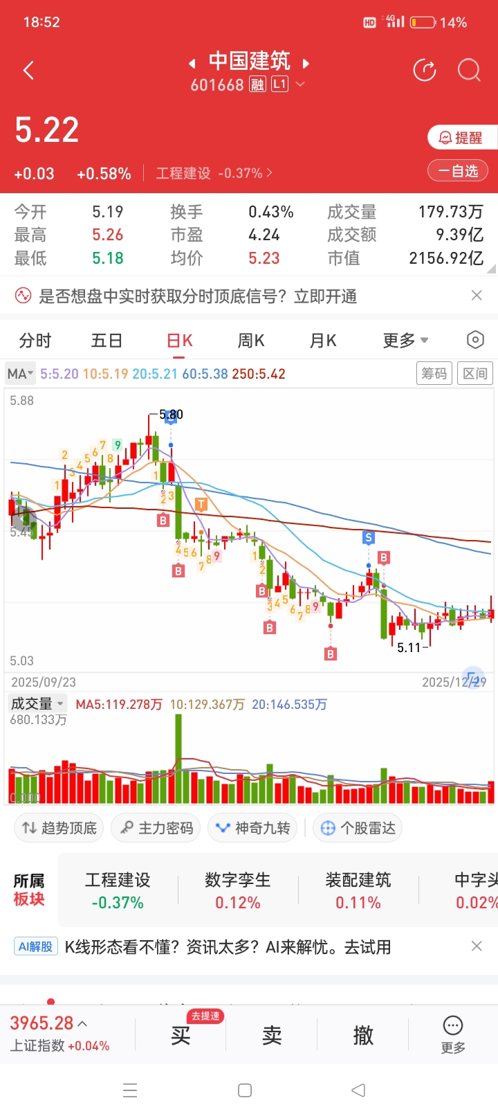 $中国建筑(SH601668)$ @基民lHNGQ7 中国建筑~典型的养老股,别当短线票做,不合适。准备拿个十年,二十年的才买,短线不买这种央企大盘股。短线博弈那2-3分钱,没得意思,看着都累。短线去追热点赛道,有色板块,商业航天这类的。买中国建筑就要有耐心,跌了吃5个点股息,涨了赚10个点卖点,逢低埋伏再等机会,这样操作的。我5.27元的成本,刚打开看看,不着急操作。