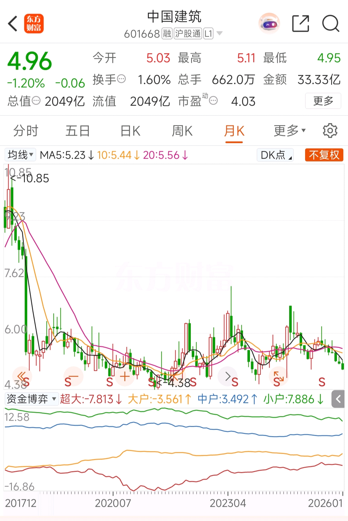 $中国建筑(SH601668)$ 中国建筑我是很看好的,钱在险中求,也在险中亏,意欲三月内本金翻倍,也必承血本无归之危也。而中国建筑拉月线来看,近10年间不复权基本稳定在4-6块钱,既无巨涨,自无大亏,诚为稳健吃息之票也。