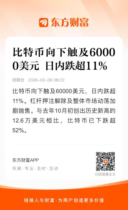 比特币向下触及60000美元,日内跌超11%。杠杆押注解除及整体市场动荡加剧抛售。与去年10月初创出历史新高的12.6万美元相比,比特币已下跌超52%。