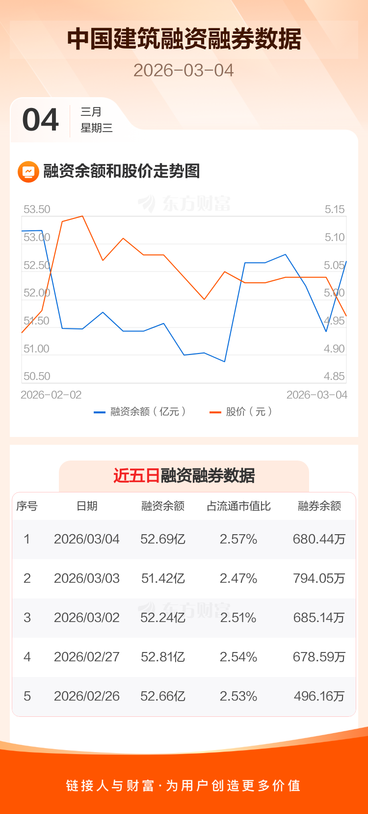 交易所最新数据显示,中国建筑于2026年3月4日获融资买入2.95亿元,融资偿还1.68亿元,当日融资净买入1.27亿元。目前,该股融资余额52.69亿,占流通市值比例为2.57%。