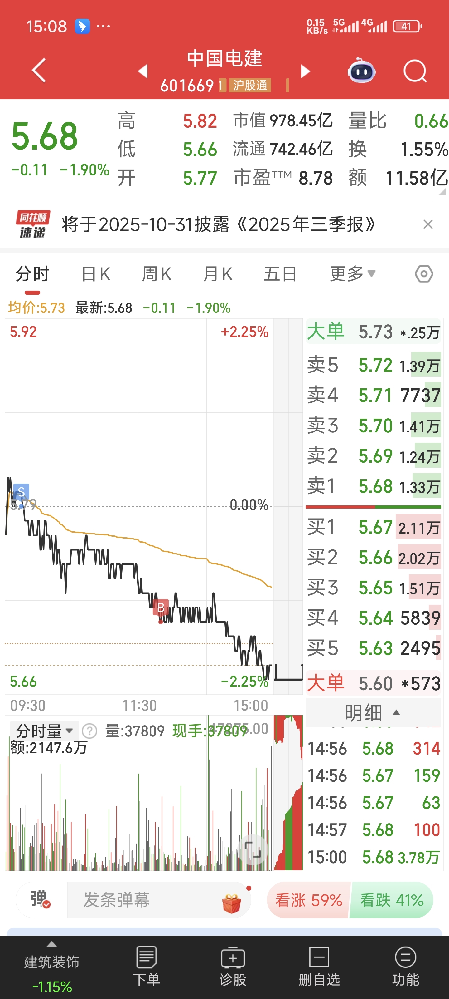 $中国电建(SH601669)$ 做了个小t,亏了三分钱,心疼,下周一还得跑