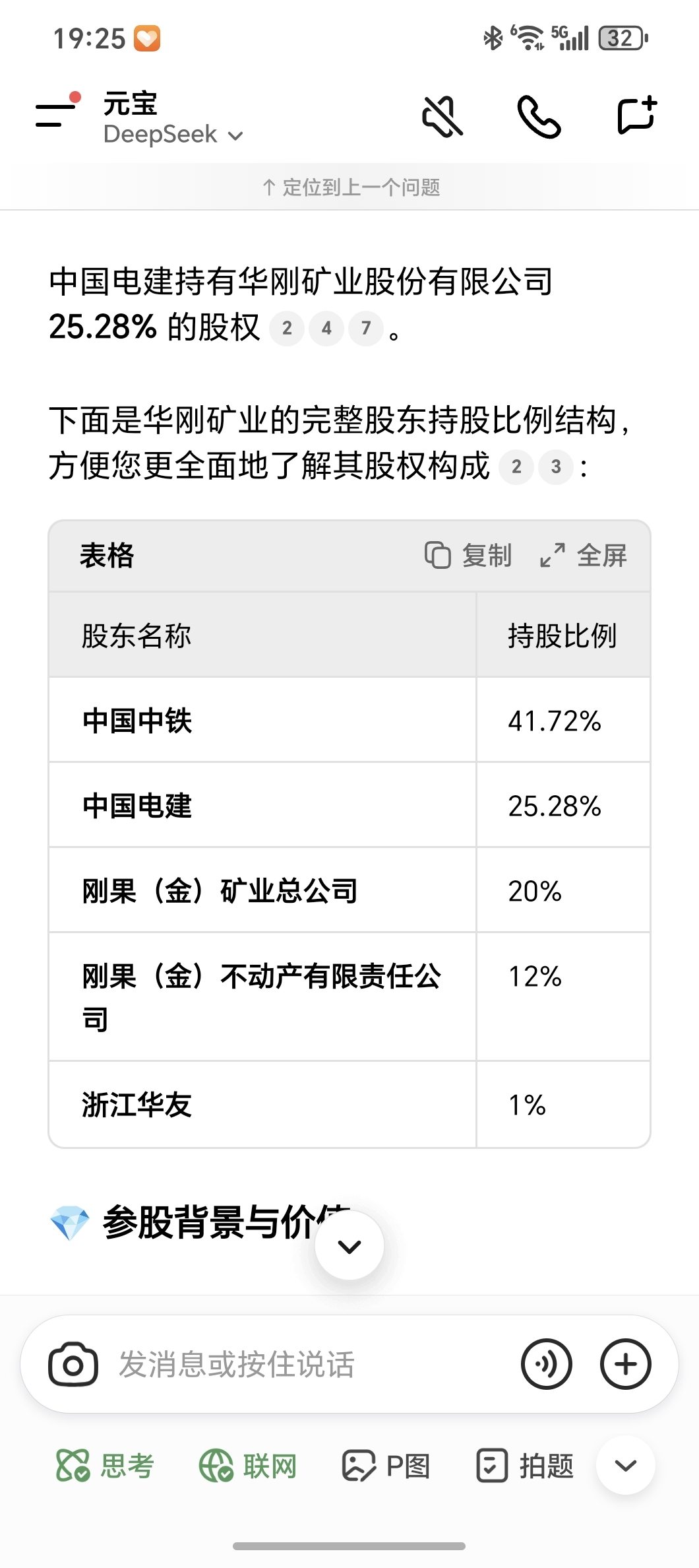 $中国电建(SH601669)$ 中国电建持有华刚矿业股份有限公司 25.28% 的股权。