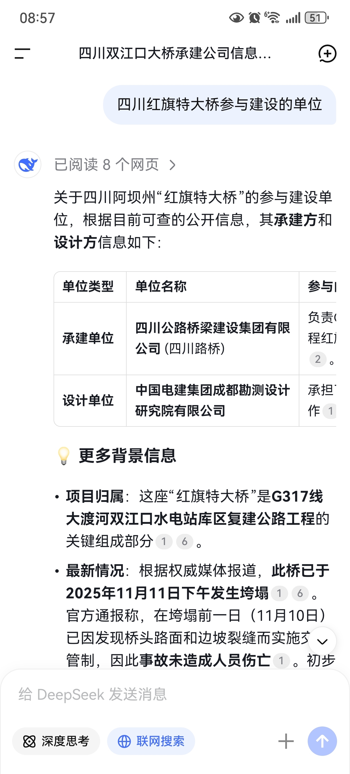 桥是电建子公司设计的,建设单位是四川路桥,不知道是设计问题 还是建设偷工减料问题,现在还很难判断