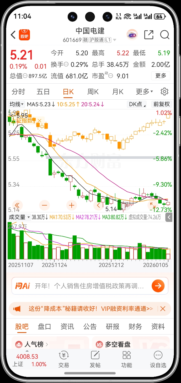 上次大盘在4000点的时候电建在5.9元,现在大盘又上4000点了,电建还在5.