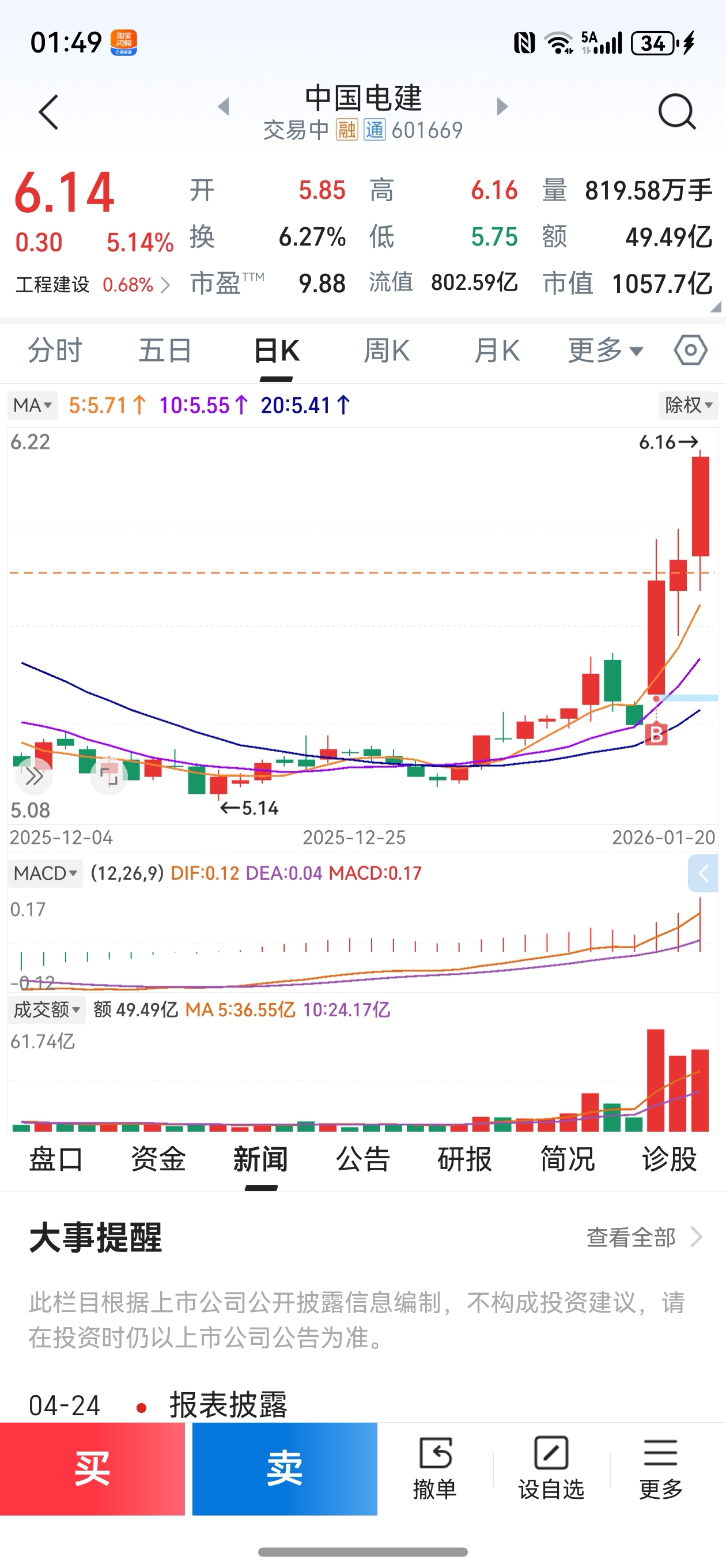 $中国电建(SH601669)$ 明天应该还会涨吧?有点拿不住,有大哥分析一下吗?