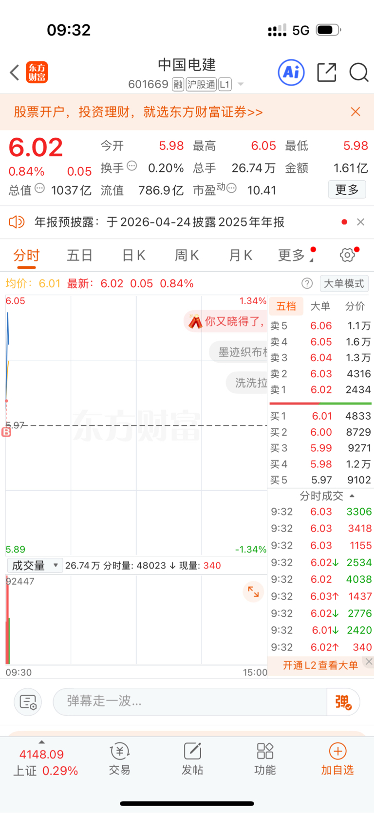 5.98选择低吸介入$中国电建(SH601669)$ #强势机会# #实盘记录# #投资干货# #投资随笔#