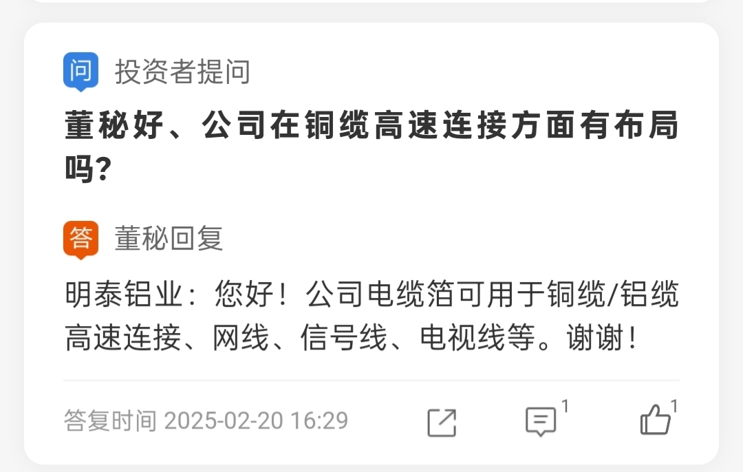 $明泰铝业(SH601677)$ 铜缆高速连接概念