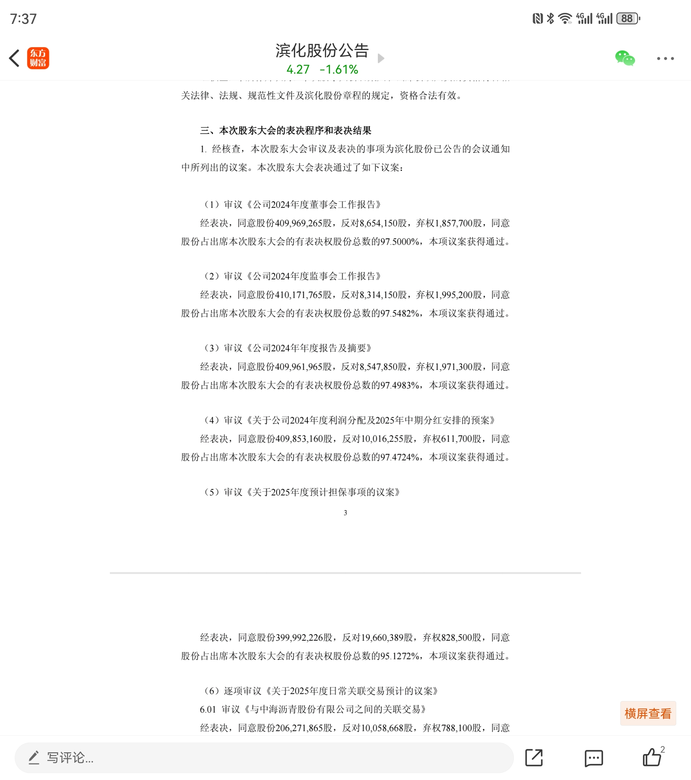 $滨化股份(SH601678)$ 怎么才能要求查看投票数据,年度股东大会没有回避的情况下才4亿赞成票,现在这么多回避,还有4.4亿赞成票,完全不合理。