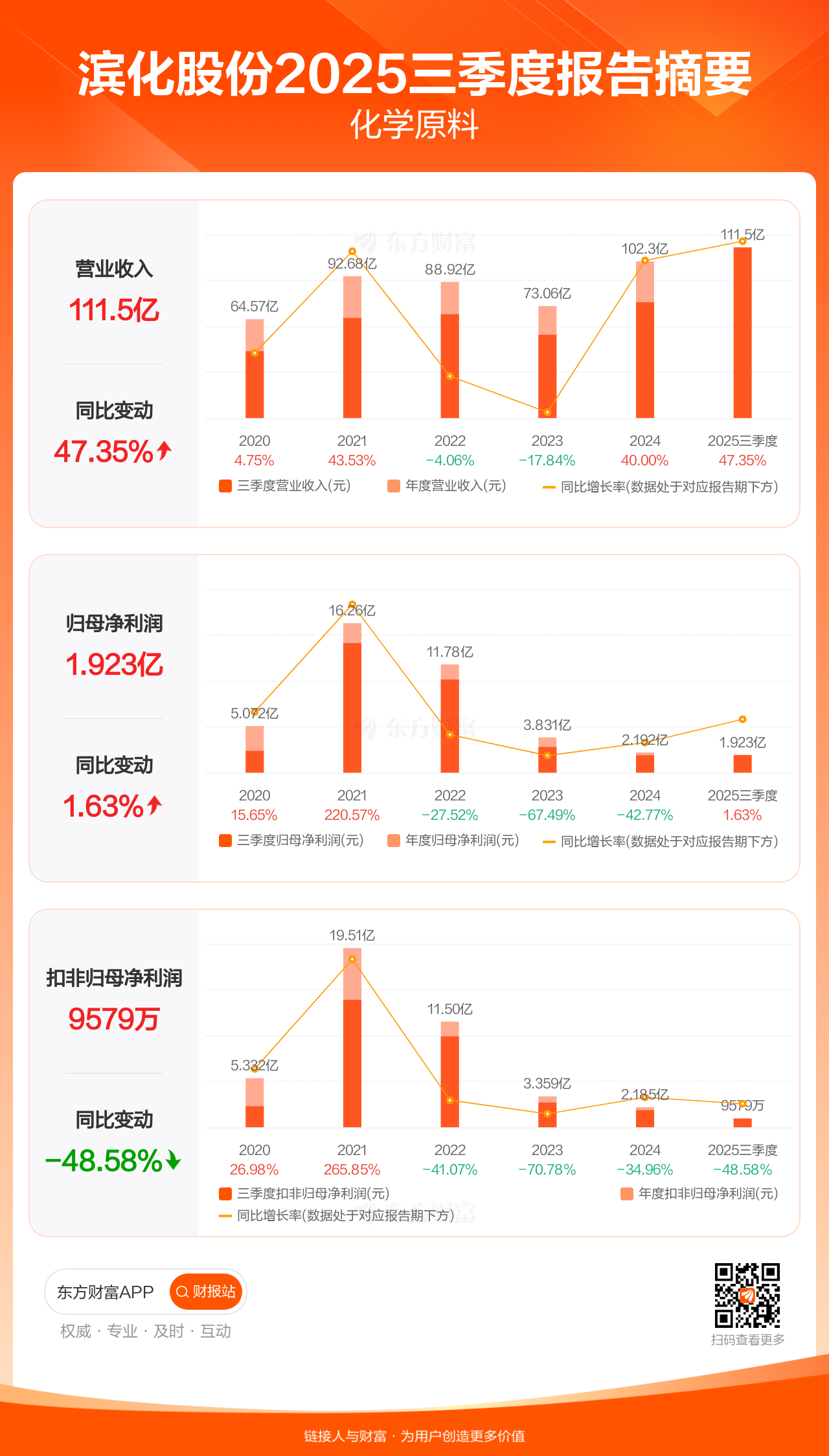 滨化股份10月31日发布2025年三季报显示,公司前三季实现营业收入111.48亿元,同比增长47.35%;归母净利润1.92亿元,同比增长1.63%;扣非归母净利润9579.01万元,同比下滑48.58%。