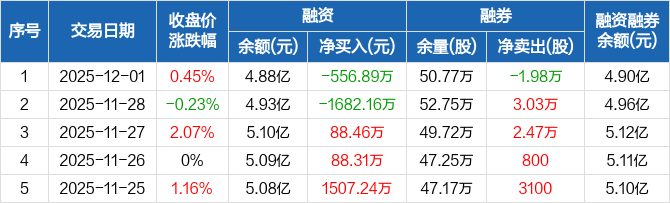 滨化股份:融资净偿还556.89万元,融资余额4.88亿元(12-01)