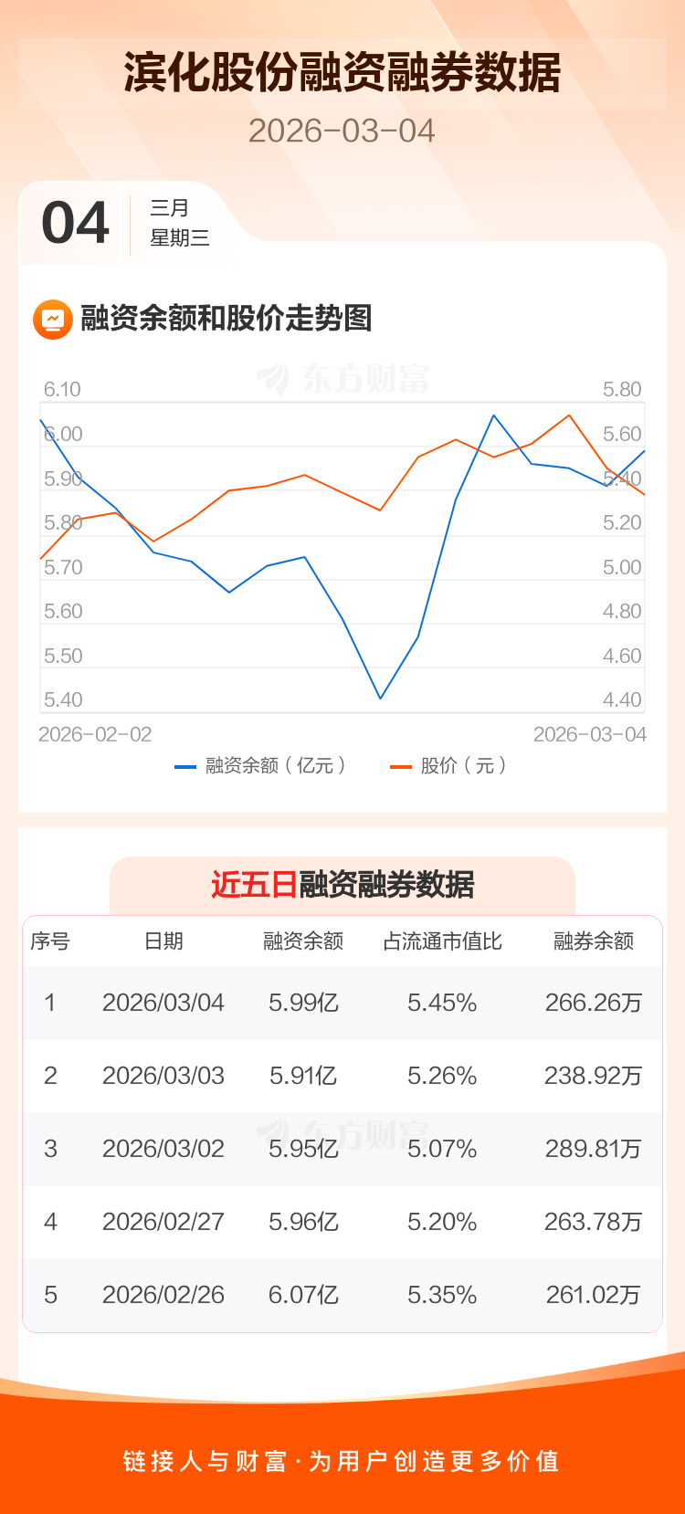 交易所最新数据显示,滨化股份于2026年3月4日获融资买入5438.69万元,融资偿还4656.04万元,当日融资净买入782.65万元。目前,该股融资余额5.99亿,占流通市值比例为5.45%。
