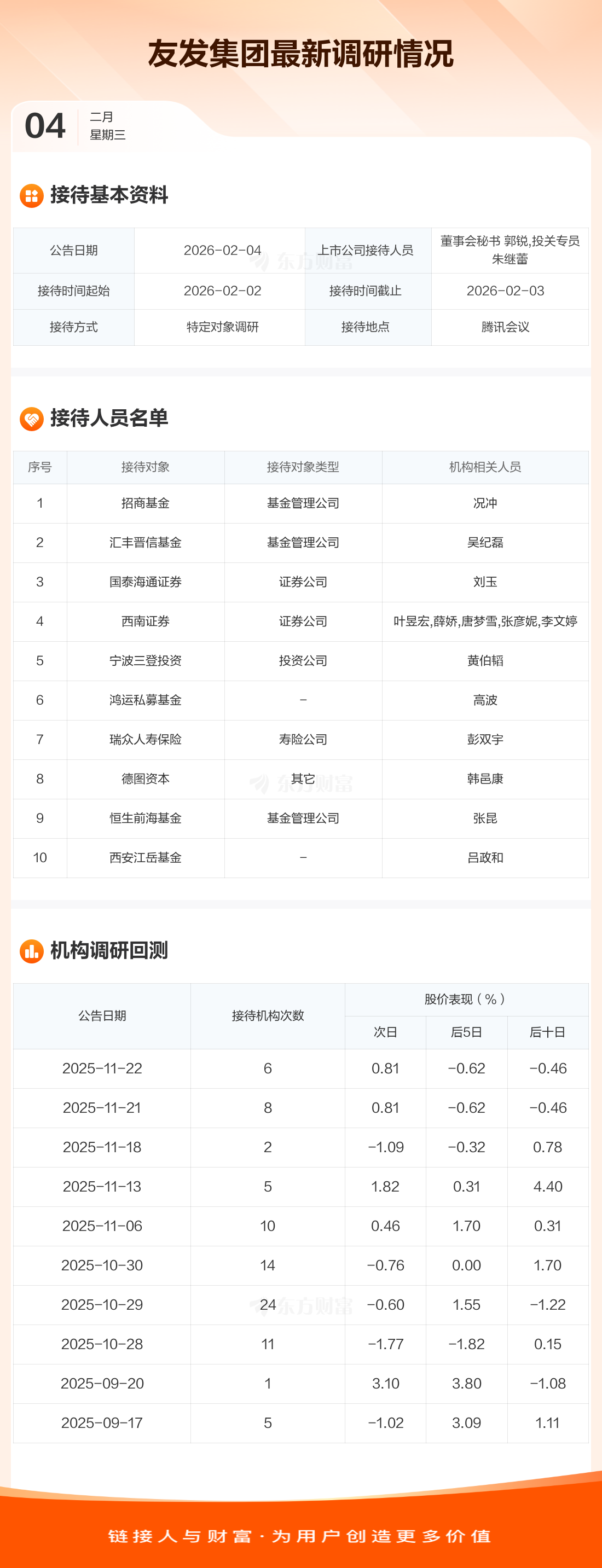 友发集团2月4日公告称,2月2日至2月3日接待招商基金等10家机构调研。接待人员包括董事会秘书 郭锐,投关专员 朱继蕾。