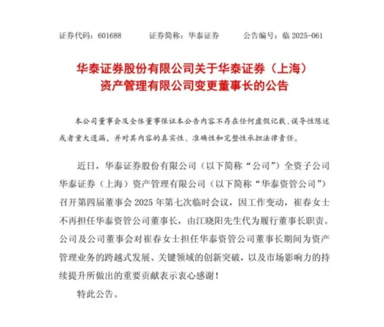 同日,华泰证券也发布了关于华泰证券资管变更董事长的公告。