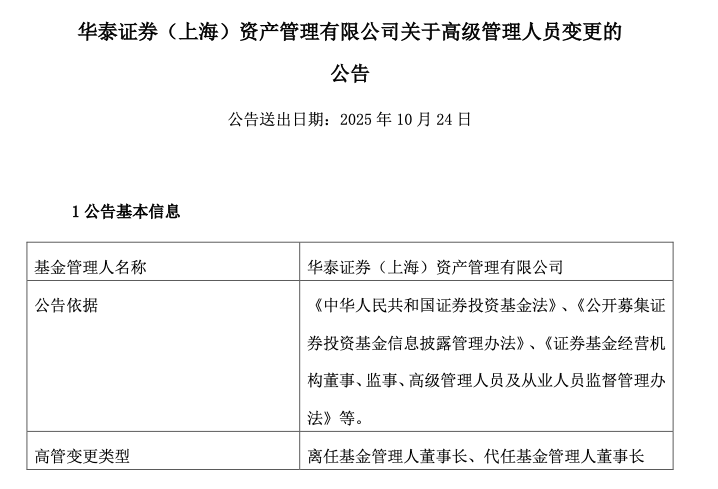 10月24日,华泰证券资管发布高管变动公告,江晓阳代任董事长职务,崔春因工作变动,不再担任董事长。