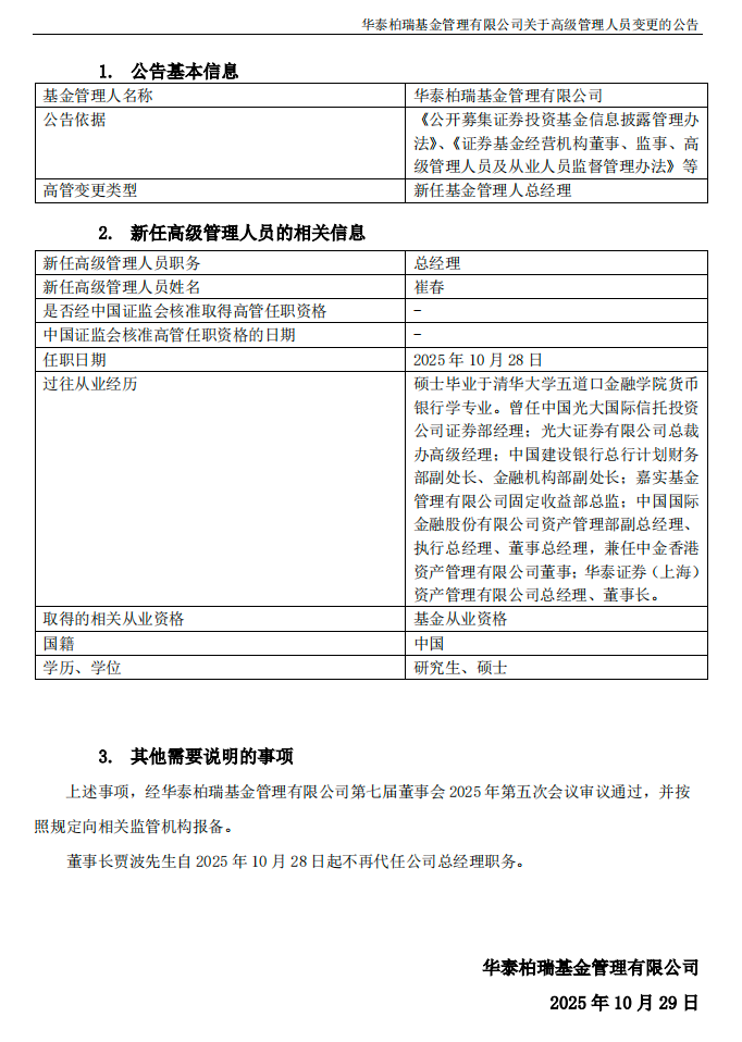 10月28日,华泰柏瑞基金公告称,前华泰证券(上海)资产管理有限公司(下称“华泰证券资管”)董事长崔春新任公司总经理,董事长贾波不再代行总经理职责。