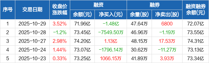 华泰证券融资融券信息显示,2025年10月29日融资净偿还1.48亿元;融资余额71.96亿元,较前一日下降2.02%。