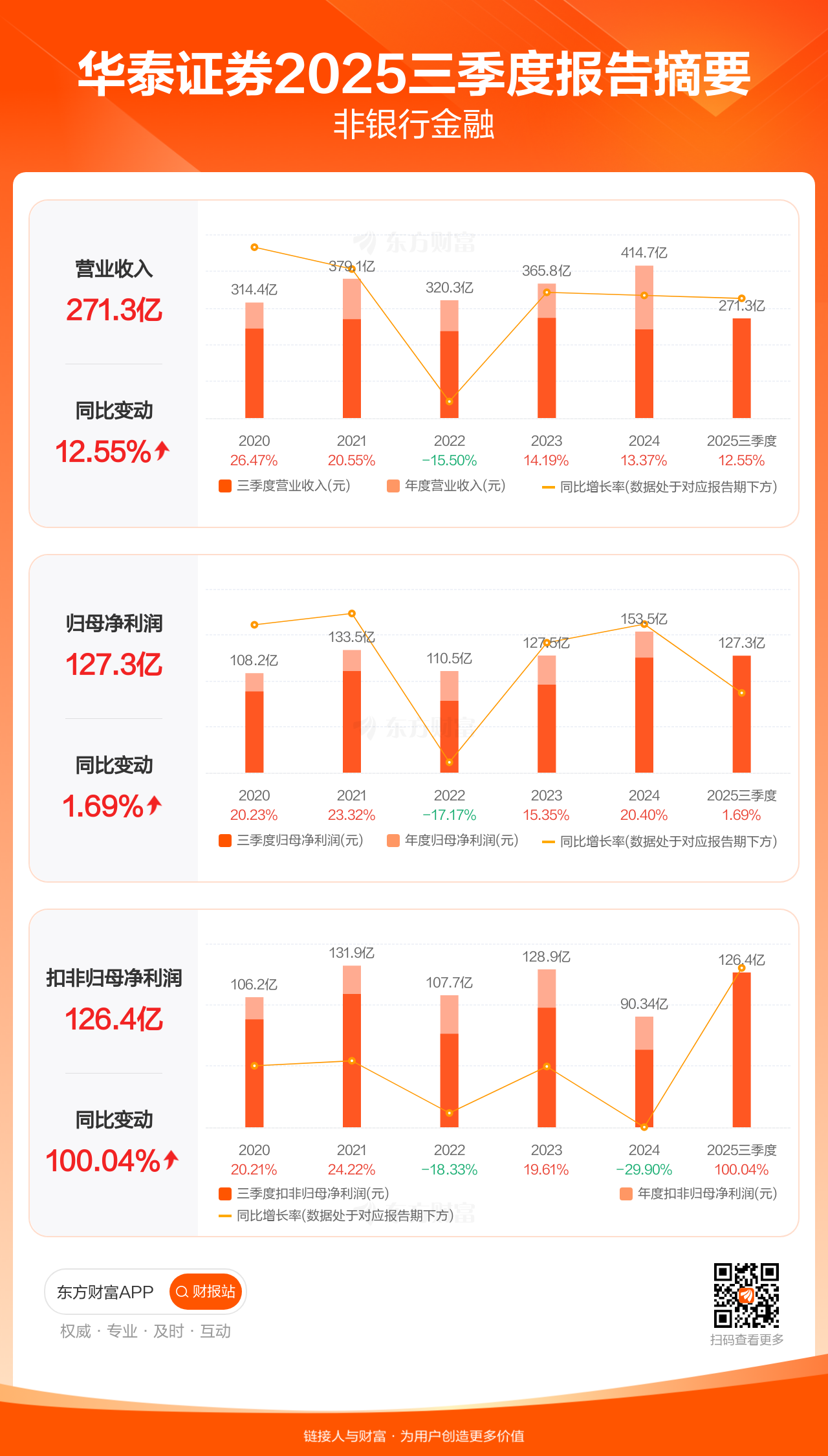 华泰证券10月31日发布2025年三季报显示,公司前三季实现营业收入271.29亿元,同比增长12.55%;归母净利润127.33亿元,同比增长1.69%;扣非归母净利润126.39亿元,同比增长100.04%。
