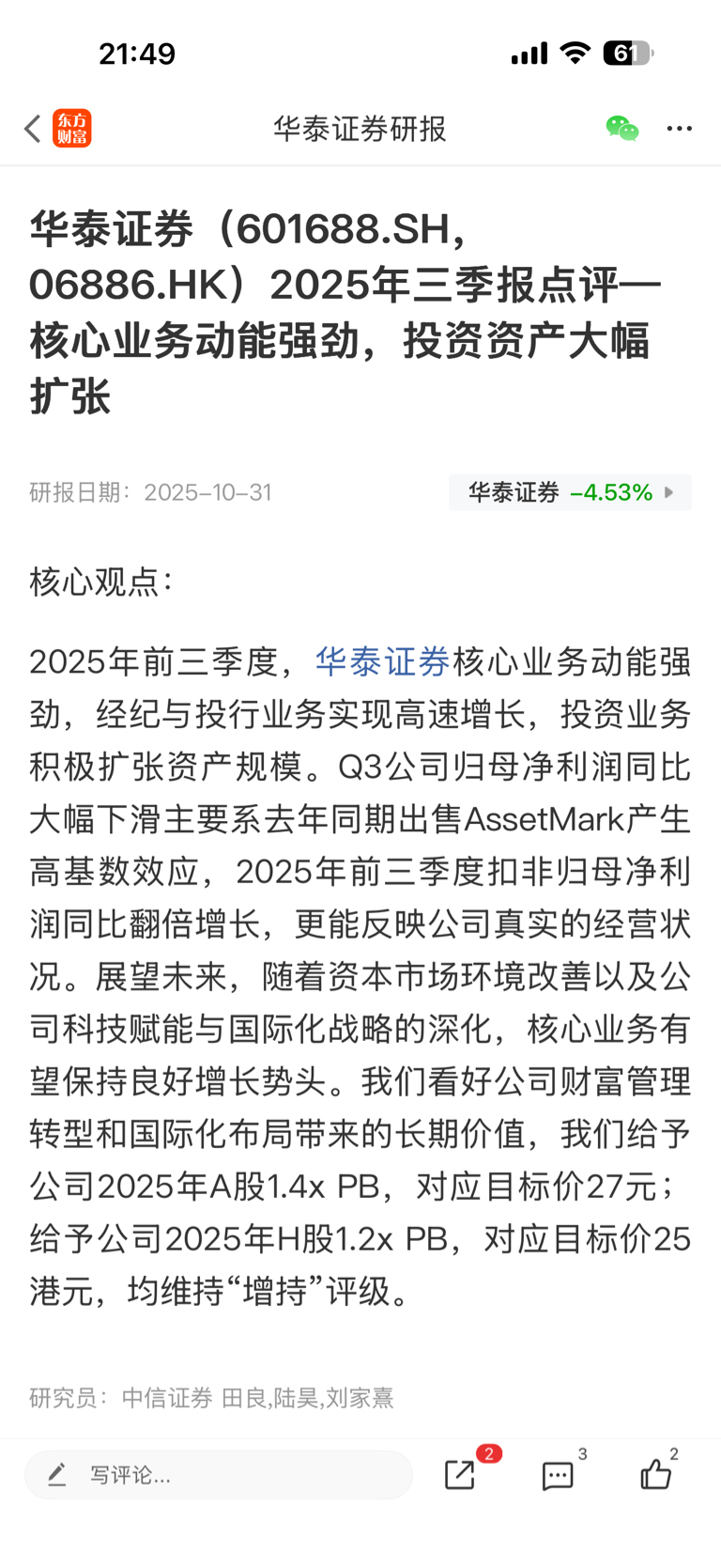 中信证券给予华泰证券目标价27.国泰海通给予华泰证券目标价28.18!既说明华泰