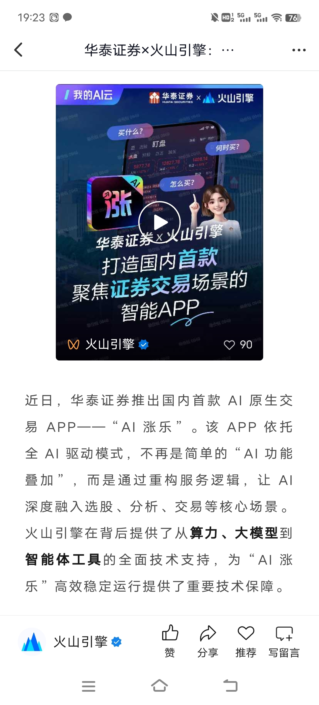 $华泰证券(SH601688)$ 华泰证券×火山引擎:打造国内首款AI原生交易APP