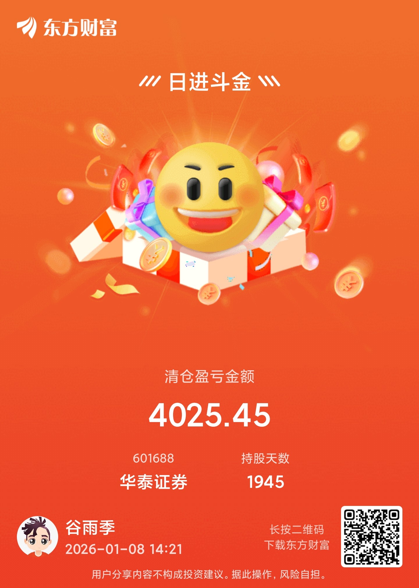 $华泰证券(SH601688)$ 1945天的投资结束了。新年伊始,拉高5个点,这就是为我准备的呀。