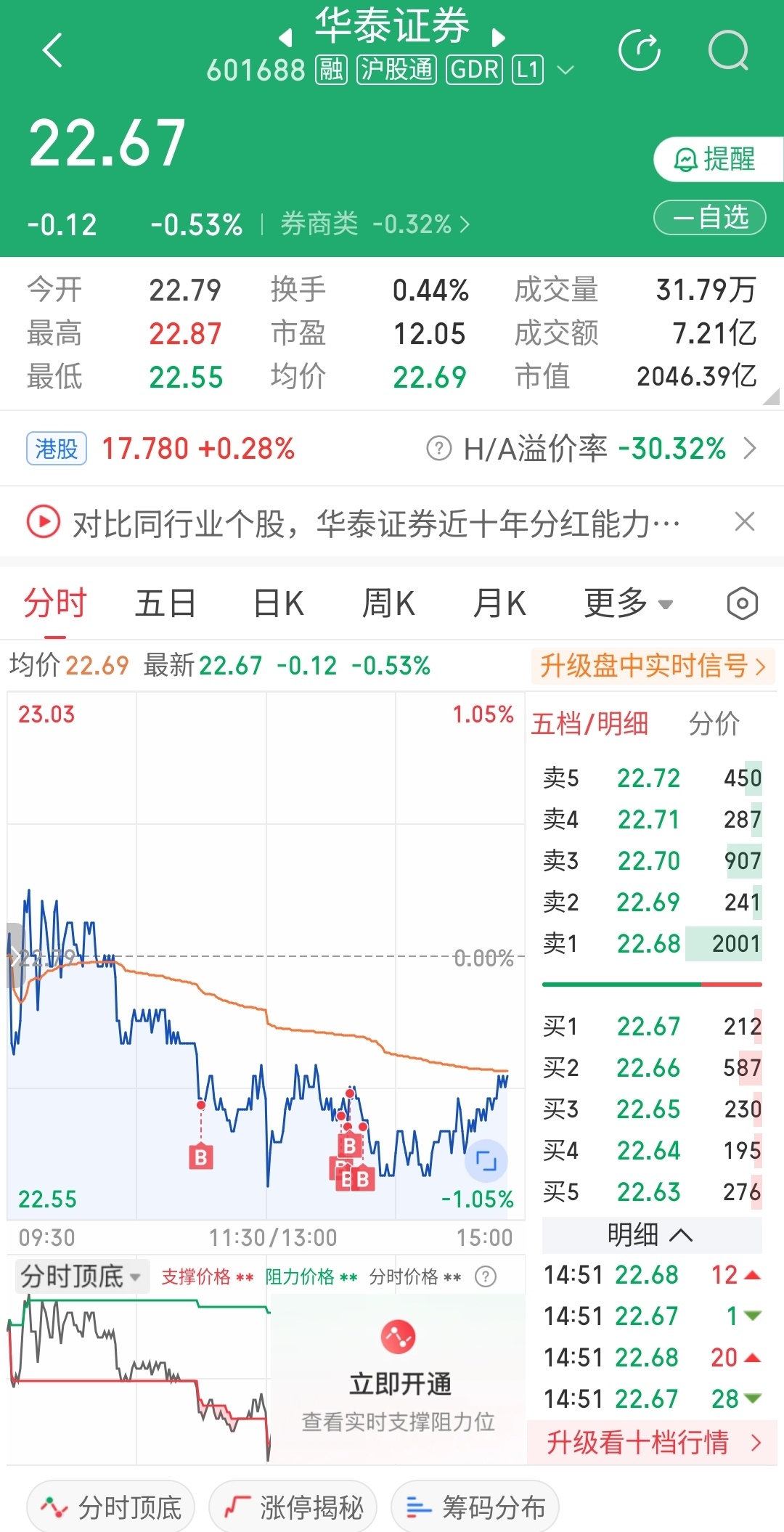 $华泰证券(SH601688)$ 看主力今天放我走还是明天放我走,22.7已挂单